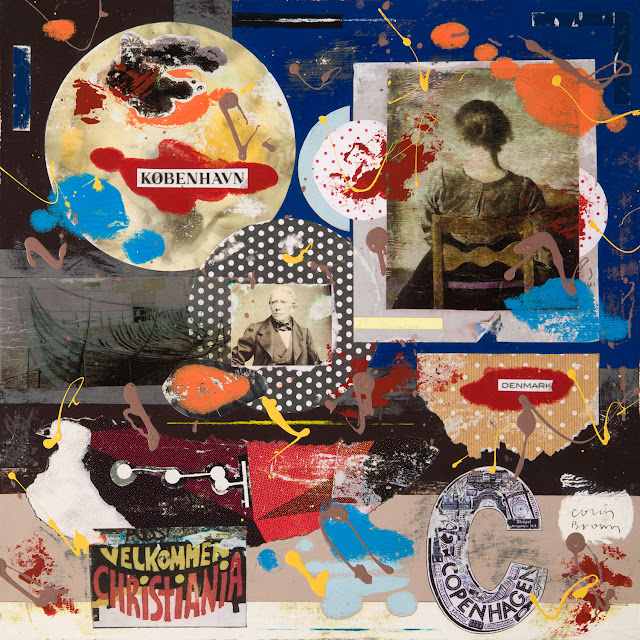 In a work like Copenhagen (mixed media, 40 x 40cm) we see materials and imagery anchored to place, but equally transcending it. Fragments of identity are lovingly acknowledged in the presence of a Vilhelm Hammershøi portrait. The woman with her back to us feels like the still, beautifully honed soul of this work. It’s the depth hidden in reserved character, collective and individual, which the artist positions in the high right-hand corner, characteristically accented with vibrant paintwork in unexpected orange, red and blue. History inhabits the image through iconic references. Equally there is an undeniable energy of reinvention present, mirroring the way that cities evolve.